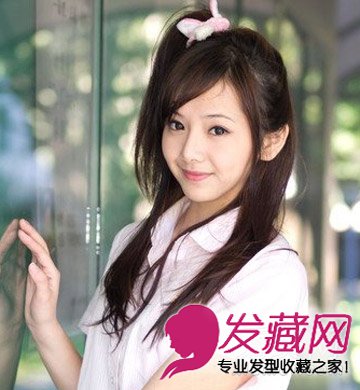 自然披肩的中长发造型,利用斜分的刘海去改善不完美的脸蛋,在发顶侧扎一个马尾辫,配上粉嫩的头饰,甜美俏皮软妹范十足。