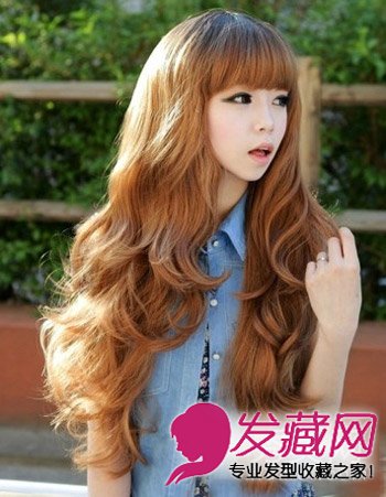 大号的波浪烫发也是韩国MM钟爱的发型,长发女生发量偏多适度打出层次,配合洋娃娃系的齐刘海烫发,乖巧俏皮。