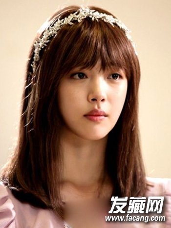 韩系MM最爱的一款瘦脸中长发,层次感设计的中长直发打造出修长的鬓发,配合齐眉的平刘海,修饰出精致的巴掌小脸。
