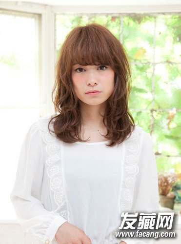 发型点评:这款中长发卷发更适合方脸MM,前额的长刘海烫出内扣弧度,遮盖住整个额头达到小脸的效果,两颊的卷发遮盖过宽的颧骨,让你的脸蛋马上柔和不少。