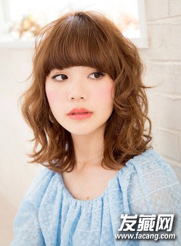 发型点评:厚重的刘海修饰出内扣感觉,衬托出一双灵气十足的双眼。棕色中长发烫发稍显凌乱,厚重饱满。