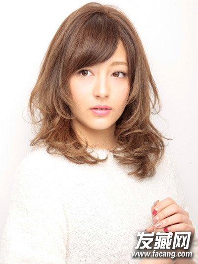 发型点评:浅棕色卷发洋溢出一股清新自然的气息,微卷的发尾颇有层次感的摆动在脸颊两侧,达到完美的修颜效果。厚重的斜刘海沿着眼角摆动,气质优雅而浪漫。