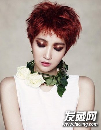 ,抢眼的红棕色发色与短发烫发的设计勾勒出别致的时尚感来,而且清爽的露耳短发十分上镜。