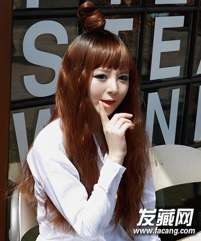 亚麻棕色蛋卷头,长长的头发烫成蛋卷,头顶梳成可爱小发髻,既增加清凉感,又使整个造型带点俏皮小心机。
