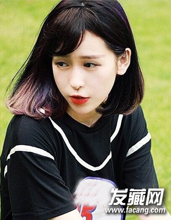 搭配起来不仅时尚而且有个性,发尾的内扣散发着甜美的气息,斜刘海自然大方,个性的紫色染发灵动时尚,颇有气质。