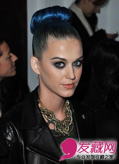 2.发型跟饰品搭配为了让丸子头不显得太幼稚,还有一种方法是利用饰品来降低头发的幼稚效果,让丸子头带有点酷味儿,比如Katy Perry这款发色是深紫色和墨绿色相间的,带有摇滚女的酷感,所有她就选择了同样是酷感风的金色 项链,连妆容也是大烟熏,很抢眼。