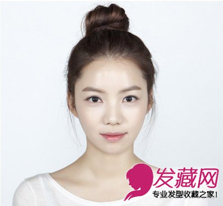 第一款丸子头造型相对比较简单,露额造型清爽自热,紧凑的丸子头展现出韩国女生精致秀气的风格。