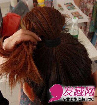 2、把扎好的头发沿着橡皮筋往前绕转一圈。
