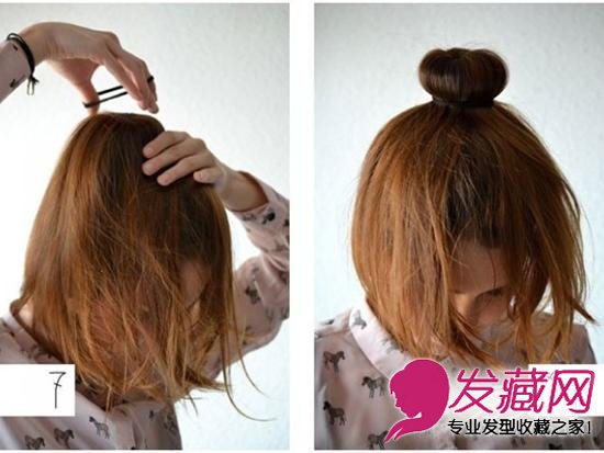 低头使马尾的头发均匀散布于丸子头发圈四周,取普通发圈将丸子头固定出形状。