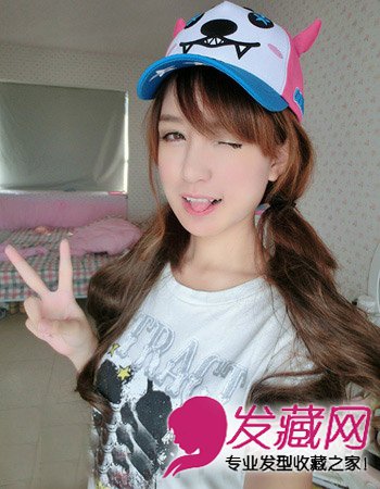 可爱的长卷发扎成双马尾的造型,再搭配个性的鸭舌帽,和女生搞怪的表情,瞬间突显出青春活泼的张力。