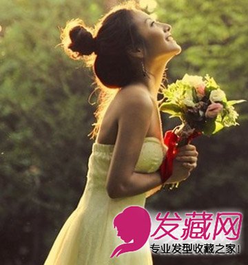 很可爱的一款丸子头发型,这是不少矮个子女生比较钟情的发型,清爽的露额发型不仅可以打造出别致的时尚感而且手捧鲜花的女生一定十分甜蜜。