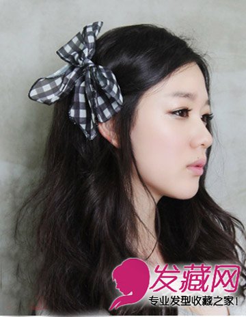 这一款韩式卷发发型,很简单的打造只在侧边轻轻别了一个黑白格的蝴蝶结发饰,这样就很好的增加了甜美而且对于矮个子的女生来说也是不错的选择。