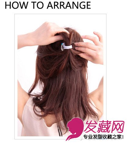 step 2:用可爱的发圈固定上面的头发,并将扎发处弄个小洞,将扎发反转。