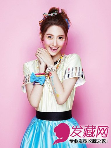 可爱系的扎发发型,甜美的妆容搭配亮眼的发饰超显梦幻气质,长发并不是都扎起来,留下一点马尾向前扣住,这样更有造型感,带上可爱的蝴蝶结变身梦幻少女吧。