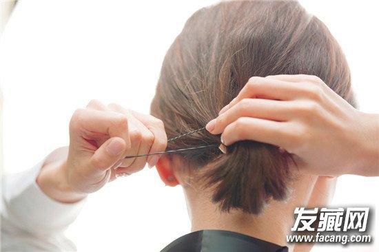 用手随意地将短发梳理通顺拢向小脑下方,用皮筋加以固定扎出超可爱的短马尾。