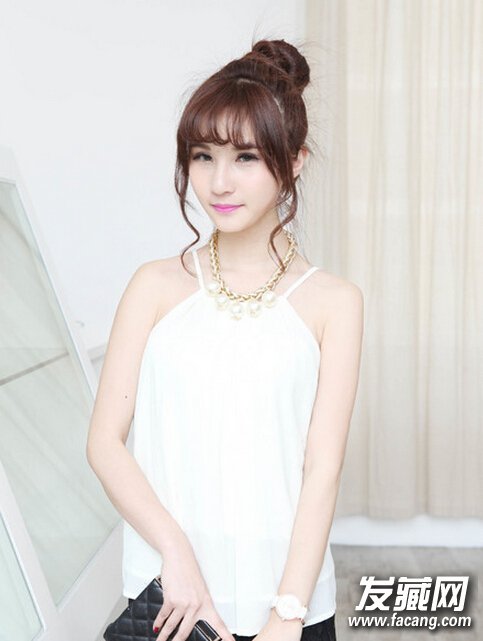 4、空气刘海优雅丸子头:简单的扎一个丸子头,在前面留点小心机,空气刘海留着,别用夹子夹上去了,还有两侧各条一条卷曲的发丝,这样看起来是不是很美,犹如公主般。
