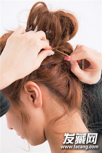 把散开的发梢部分用发卡抄进去,朝着根部插入固定。最后套上圆