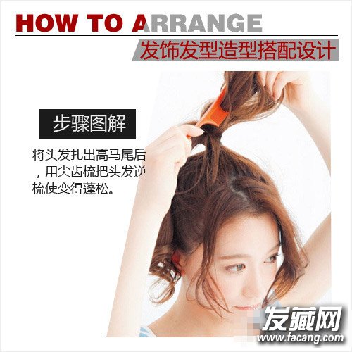 将头发扎出高马尾后,用尖齿梳把头发逆梳使变得蓬松。