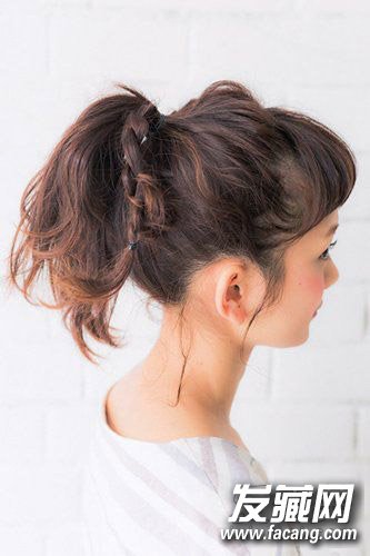3,折起在第二步中编好的三股辫,在打结的地方用发针固定。像发夹一样把打结的地方遮起来。
