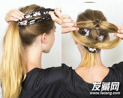 头巾缠绕几次,让它垂的像一个循环。马尾分成两部分,一部分部分就饶发绳绕圈。另外一部分马尾要穿过头巾,绕圈循环应该像老鼠的耳朵一样,让头发仍然应该藏在头巾下。