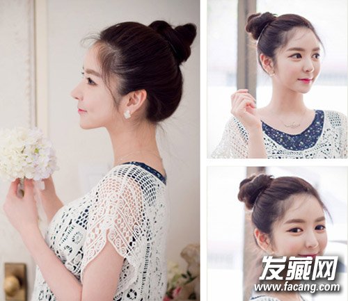 丸子发髻整齐优雅,侧梳发髻增加活泼可爱,是整个造型更加灵动,头发上梳,只留下自然散落的碎发,清爽利落,夏日清凉必备。