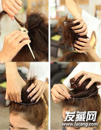 5、将马尾辫倒梳,打蓬松,然后从左至右卷起。