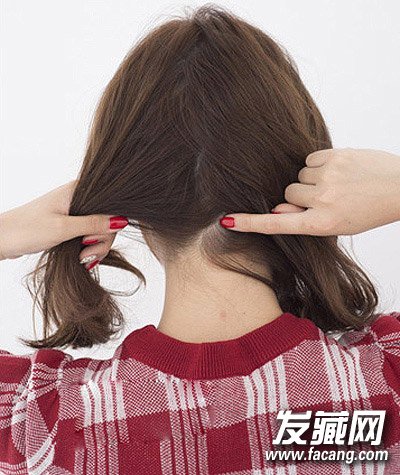 第二步:然后用手将发丝在脑后分成均等的左右两部分。如图所示。