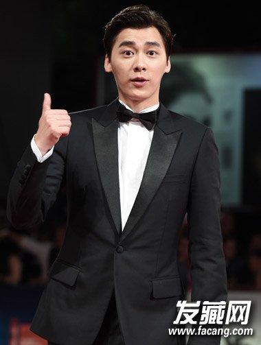 还好还有小鲜肉撑场面,《老炮儿》主演之一的李易峰,西装配领结很显绅士风度,侧分短