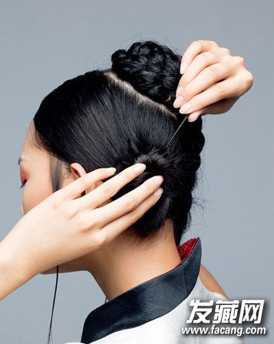 3 将盘好的发髻用黑色卡子固定,再用啫喱抚顺毛糙,将头顶以及两侧的碎发收紧,看起来非常光滑即可。