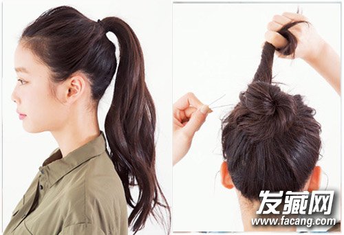 step 2:将马尾盘成发髻,一边盘一边用黑色发卡固定。