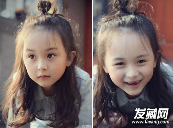 还有之前走红的萌宝刘楚恬,长发扎成半丸子头,加上自然的胎毛,真的是可爱极了呢,果然这款