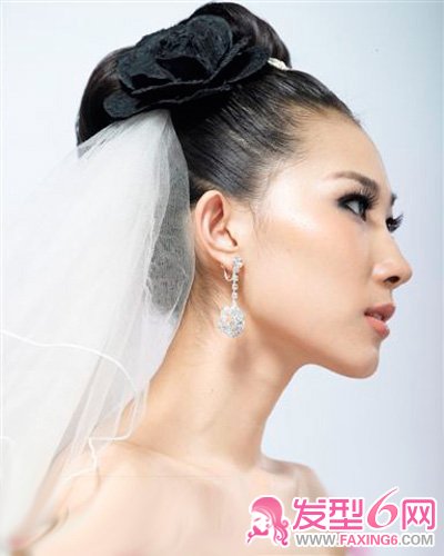 黑色花朵搭配白纱,紧贴在新娘精致发型上,干净利落,且雍容华贵。搭配白纱,唯美浪漫。