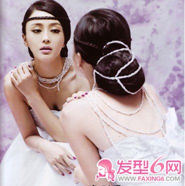 盘发发髻+前额的一股麻花辫再加上发髻后的珍珠链子凸显了希腊女神的味道!