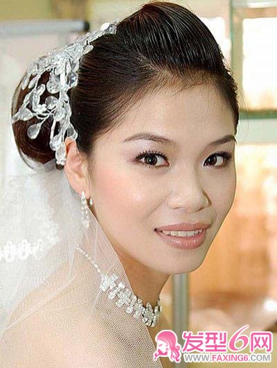 新娘发型点评水晶发饰和蕾丝白纱搭配的新娘盘发,清莹剔透。