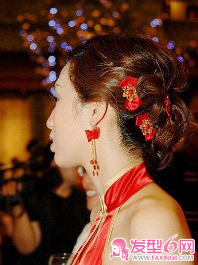 新娘发型点评红色蝴蝶结新娘发饰点缀的花朵盘发,和旗袍完美搭配。
