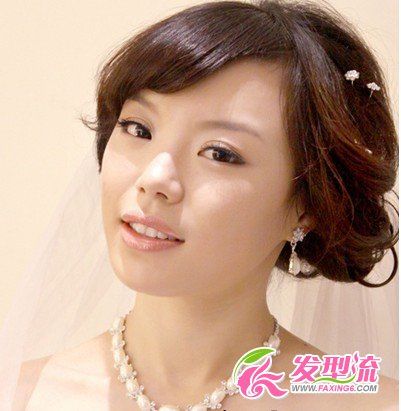 韩式风味盘发温婉浪漫,但有纯白色小发钻的衬托便时尚了许多。侧分的弧度刘海更温柔迷人。再配戴珍珠耳环和珍珠项链更显贵气!