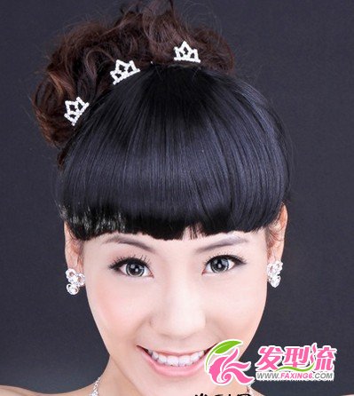 花苞的盘发,乌黑的假发片,非常的精灵可爱,再插上三个小皇冠的发钻更靓丽夺人。非常适合8090年代新娘!