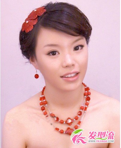 中式新娘盘发,利用两个红色发饰和红色礼服的搭配,既浪漫而又喜气洋洋的感觉。