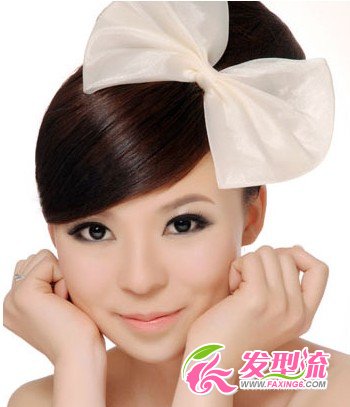 这款发型整体突出了可爱和俏皮,把头发一丝不苟梳起,打造出光滑平整,让发型更显得精致。头顶夸张的白色蝴蝶结搭配斜刘海盘发,突显出新娘热情可爱的气质。精致的妆容让你更加漂亮迷人。