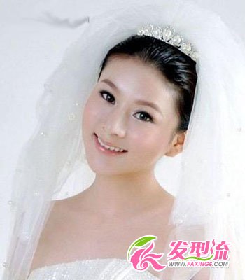 这款新娘发型图片很显优雅的气质。长长的秀发全部梳到后面盘起,把女人的妩媚展现得淋漓尽致。无刘海的设计突显精致的五官和惊艳的脸容,清爽干净,充满青春活力,是一款对脸型要求较高的发型。搭配纯白色头纱和珍珠公主皇冠,打造高贵大方的名媛淑女气质。