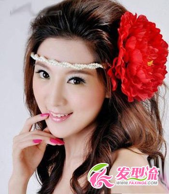 浪漫唯美的波浪大卷发,随意披肩,自然又不失优雅气质。额头的珍珠链散发出几分民族风情,夸张的大红色花朵发饰,充满了喜庆的气氛。给人热情奔放、妩媚性感的感觉,很梦幻。