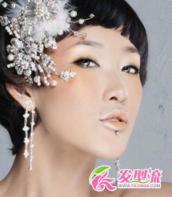 个性中带出复古味道的新娘短发造型,如果你是性格高调的女生,就不妨尝试此款短发造型哦!在额侧搭配较为中国风的古典发饰,必定让你更有韵味。妆容方面也是很显特别,想要打造出前卫感,就要大胆尝试哦!
