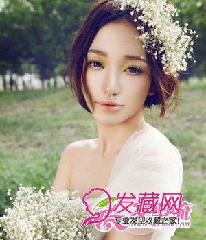 这款新娘发饰,用真花来点缀,起到了画龙点睛的效果。将长发束成发髻,包耳的设计保留了韩式风格,是很多MM喜欢的造型。洋溢着女人味的中分长刘海,两侧余留几缕发丝自然垂落,增添了造型感和动感活力。加上满天星花朵,让整个发型弥漫着芳香迷人的气息。