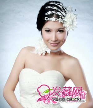 个性发饰 一款很显个性的新娘发饰,采用爪式的设计,给人眼前一亮的感觉。采用全盘发的方式,把全部头发束成发髻,突显出精致的五官和姣好的脸容,给人感觉充满了青春活力。精美、华丽的发饰让新娘的气质更加迷人。