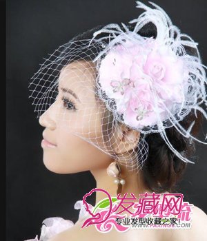 清爽的盘发,给人感觉精神饱满,充满年轻和活力的气息。粉色系的发饰,是很多年轻MM的最爱,可以增添可爱甜美气质。而网状面纱设计,则多了几分小女人的性感和迷人的神秘感。