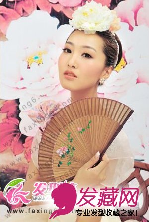复古式的新娘盘发利用洁白色的牡丹花做发饰点缀,显得整个新娘发型的气质非常的高雅,干净利落的盘发时尚美丽,让你变成为最美的美娇娘。