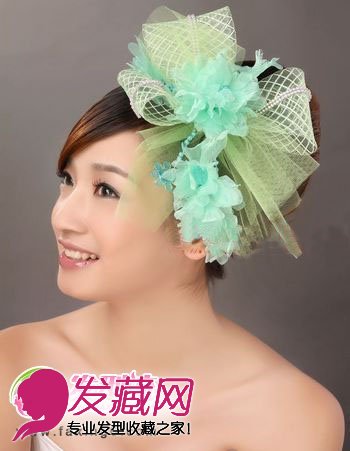 经典但不落俗套的新娘盘发发型,柔顺有光泽的斜刘海具有很好的瘦脸作用,使新娘的脸型更见完美漂亮,浅绿色的新年头花作为点缀,使
