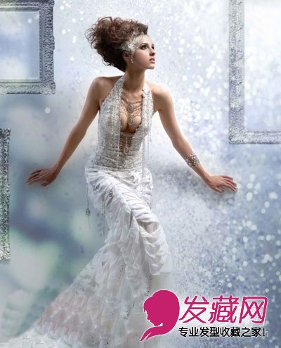 长长的婚纱,美艳无比,性感诱惑,在顶部的头发扎发,在宫廷发髻的基础上改良,卷度是这款新娘发型的新亮点,很个性和唯美。