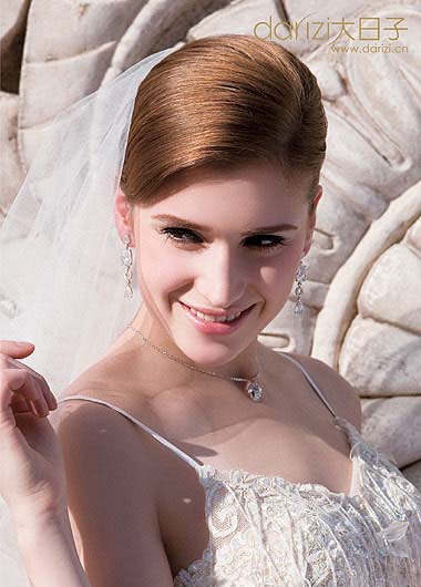 披头纱的新娘造型一定是配合着盘起的发髻,造型有很多方式可以选择:可以将发髻高高束起,将头纱别在发髻的下面散开;可以将头纱盖在发髻之上盖满整个头部;或者可以将头纱放在适中的位置。