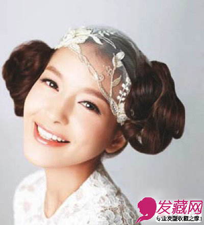 非常甜美可爱,将头发梳成两个不对称的发髻,非常新颖个性,尽显俏皮活泼。加上花朵式的头纱点缀,真是太迷人了,画上精致的淡妆,你就是最纯真唯美的新娘。